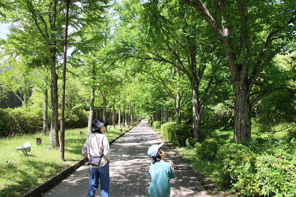 マップを見ると、アスレチックは広大な敷地の中ほど。受付の方に、「バスもありますが、歩いても5分ほどですよ~」と教えてもらったので、せっかくならばと歩きます! 美しい花が咲くフラワーデッキや並木道、そばを流れる小川など、地元民でも思わず、「えっ、めっちゃええやん」とつぶやいてしまいます。