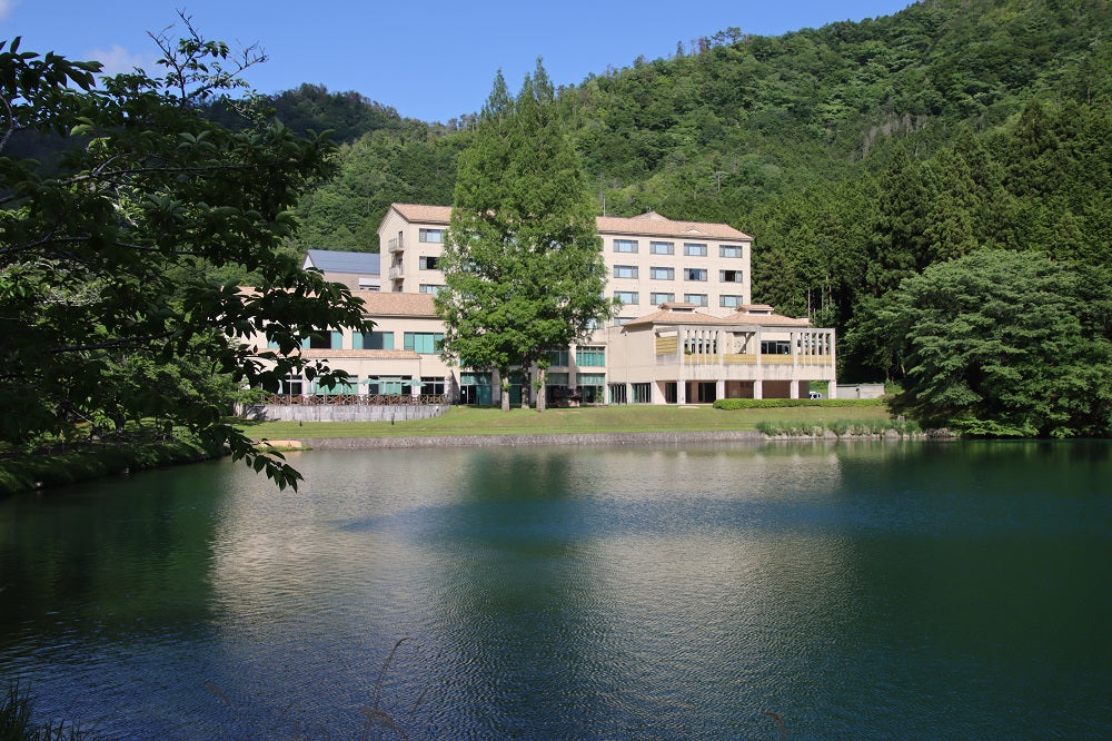 さすがに疲れたので自動販売機でアイスを買って散策します。アスレチックから少し歩くと、美しい池のほとりにたたずむきれいなホテル。こちらも絵になりますね。