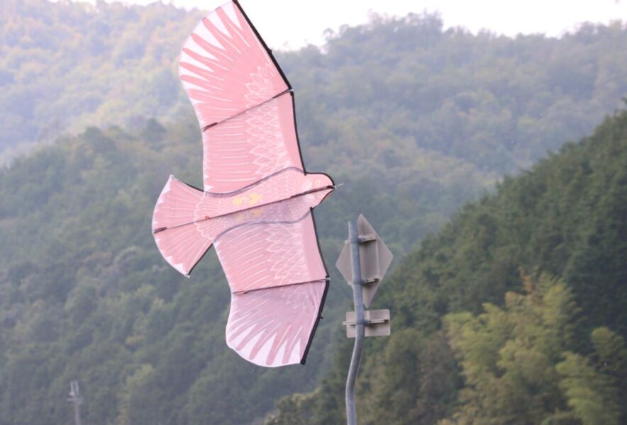 カイト鷹を設置する目的は、カラスなど農作物を狙ってやってくる鳥をよせつけないため!かかしの飛んでいるバージョンなんですね(^^)